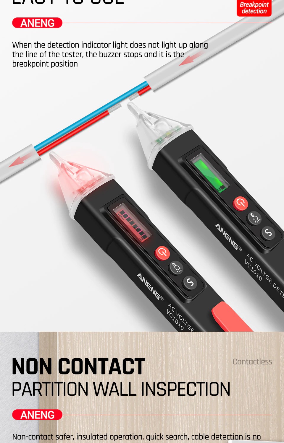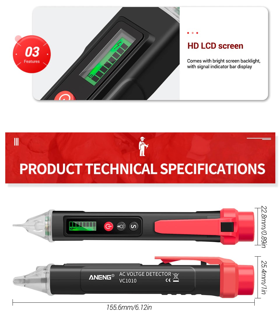 Aneng Vc1010 Digital Ac/Dc Detectores De Voltaje Pluma Voltimetro Analogico Tension Inteligente No Bolígrafo De Contacto Probador Medidor 12-1000V Volt Lápiz Boligrafo Detector De Corriente Corriente Eléctrica