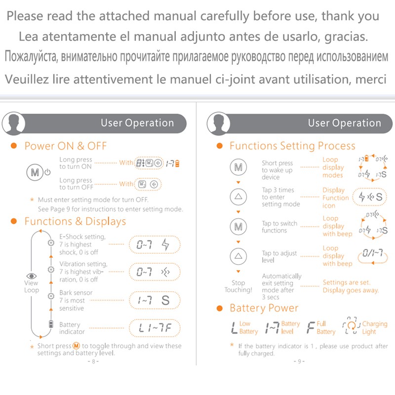 3 modos de entrenamiento y sistema de protección automático-el collar ladrido tiene 3 modos de entrenamiento que incluyen "pitido + vibración + e-shock" modo de configuración predeterminado y 0-7 nivel de sensibilidad ajustable. Deja de ladrar sin dañar a los perros. Seleccione el modo y nivel más adecuado libremente según sus necesidades. El dispositivo se apagará durante un minuto después de siete activadores consecutivos y volverá al estado inicial para proteger a la mascota.