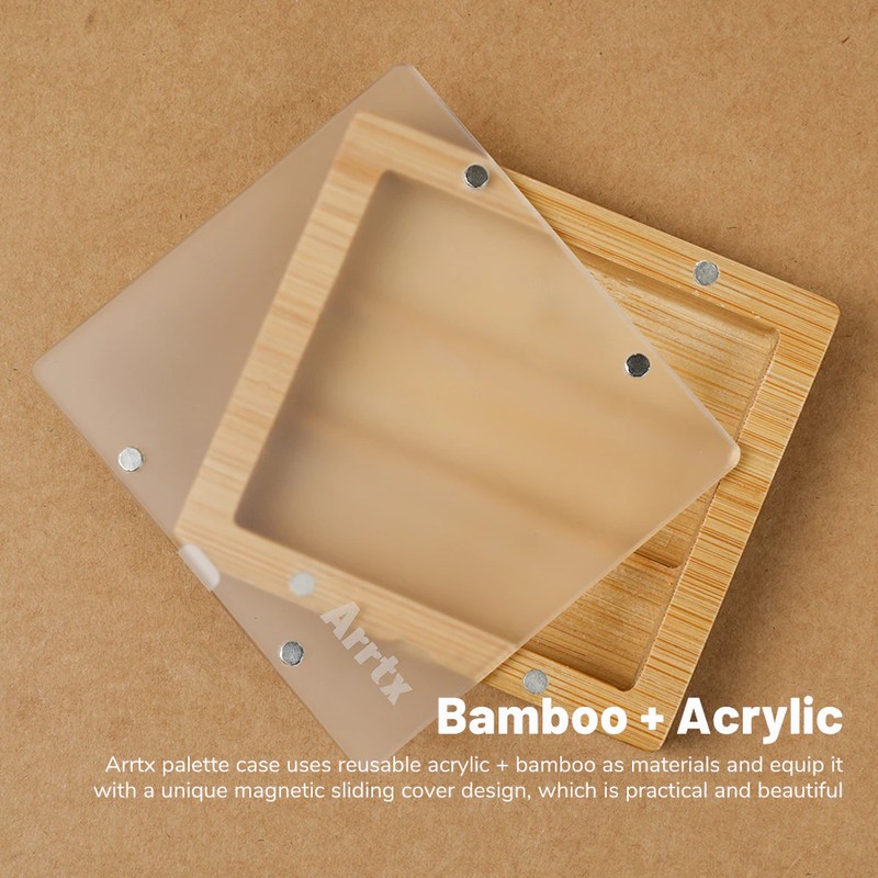 La caja de paleta de bambú + acrílico Arrtx es totalmente diferente de la caja de lata normal. Utilizamos acrílico + bambú reutilizable como materiales y Lo equipamos con un diseño de cubierta deslizante magnético único, que es práctico y hermoso. La superficie de la caja de bambú tiene una textura natural, y los bordes son delicados y redondos. La funda acrílica tiene una textura esmerilada con un tacto muy cómodo.