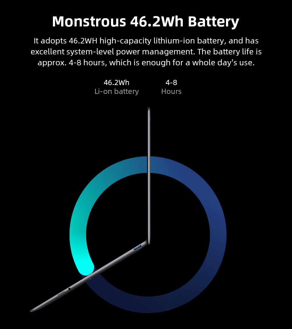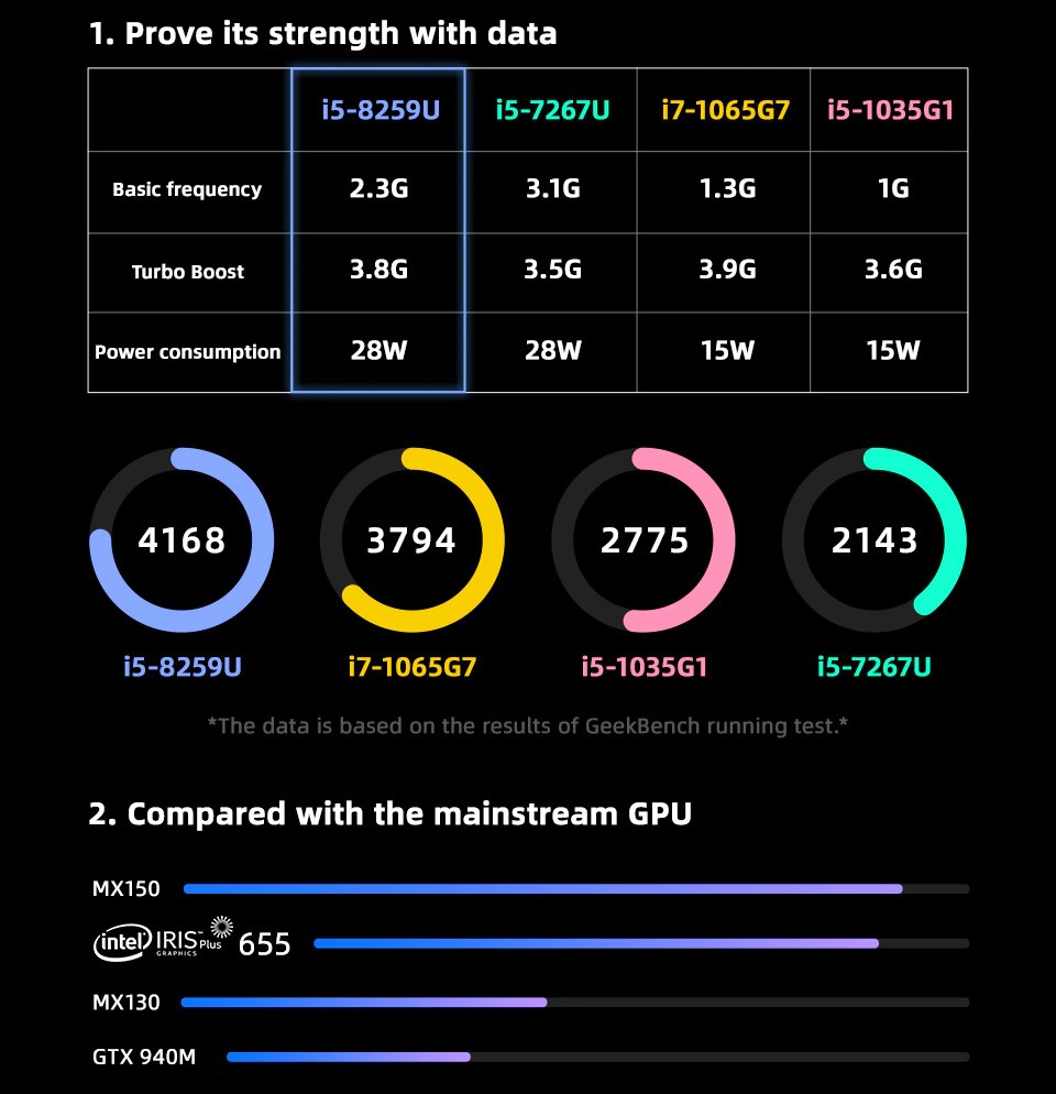 ![]() Información básica | Marca: CHUWI Modelo: CoreBook X Sistema operativo: Windows 10 preinstalado CPU: Intel Core i5-8259U Núcleo: 4 núcleos, 8 hilos, 14nm, 2,3G-3,8G GPU: Intel Iris Plus gráficos de 655.300-1,05 GHz Batería: 46.2Wh (11,55 V/4000MA |