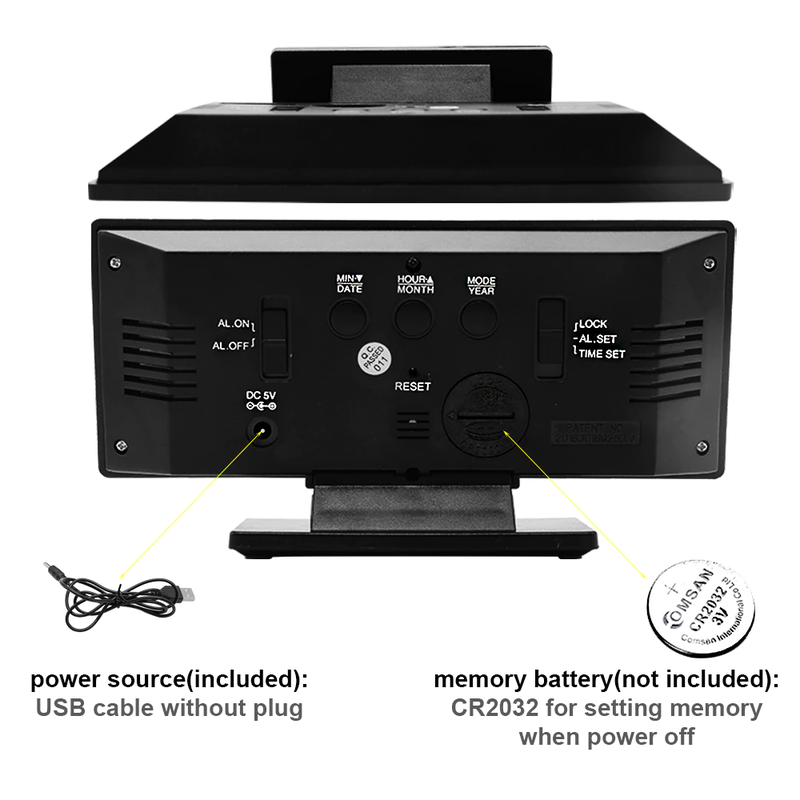 5. Función de memoria de datos: cuando solo use 3 baterías AAA como potencia, el reloj puede memorizar su configuración, pero la pantalla solo se ilumina 5s, debe pulsar el botón SNZ / LIGHT para encender la pantalla de nuevo. Cuando solo usa cable USB como fuente de alimentación, la pantalla siempre se puede encender, pero no se puede guardar su configuración cuando se apaga. Sugerimos utilizar baterías y cable USB al mismo tiempo.