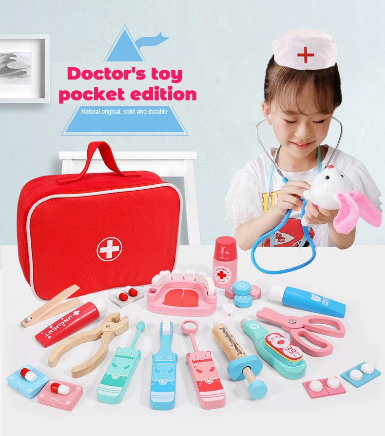 Juego de juguetes para niños, juego de médicos para niños, juegos para niñas, niños, simulación, juego de madera, caja de medicina médica roja, bolsa de tela