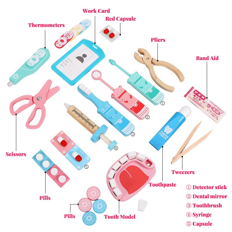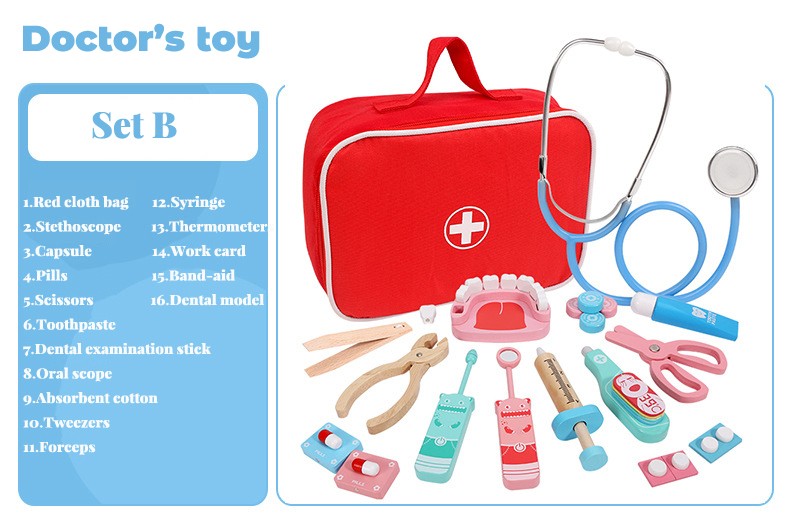 Conjunto De Juguetes Médicos Para Niños, Kit De Juegos Madera Para Niñas Y Niños, Caja Medicina Y Dentista Médica Roja, Bolsas De Tela