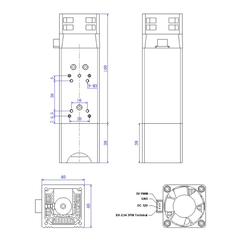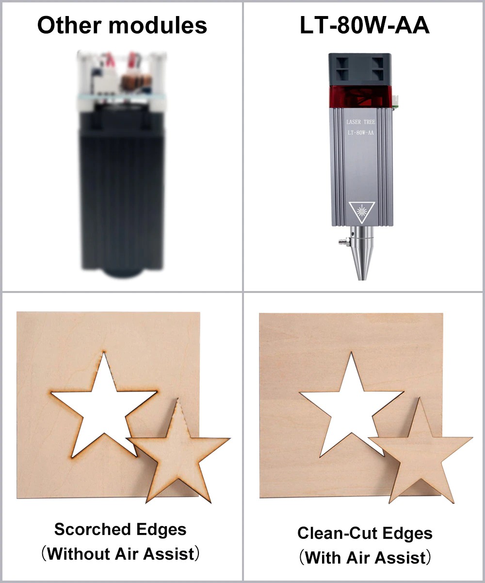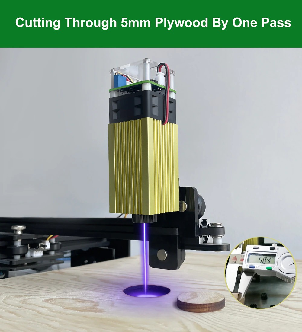 Módulo láser azul con asistencia aérea, alta velocidad, alta estabilidad, excelente efecto de corte, luz azul brillante, fácil posicionamiento al grabar.