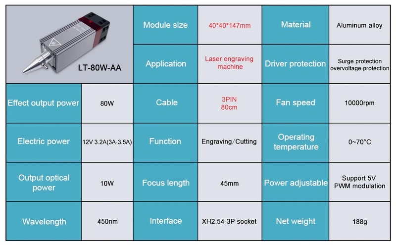 El módulo láser azul está especialmente diseñado para fresadora CNC y corte DIY. La longitud de onda es de 450nm, el enfoque fijo es de 45mm, que es una herramienta eficaz para el corte por láser. Pueden grabar y cortar varios materiales.