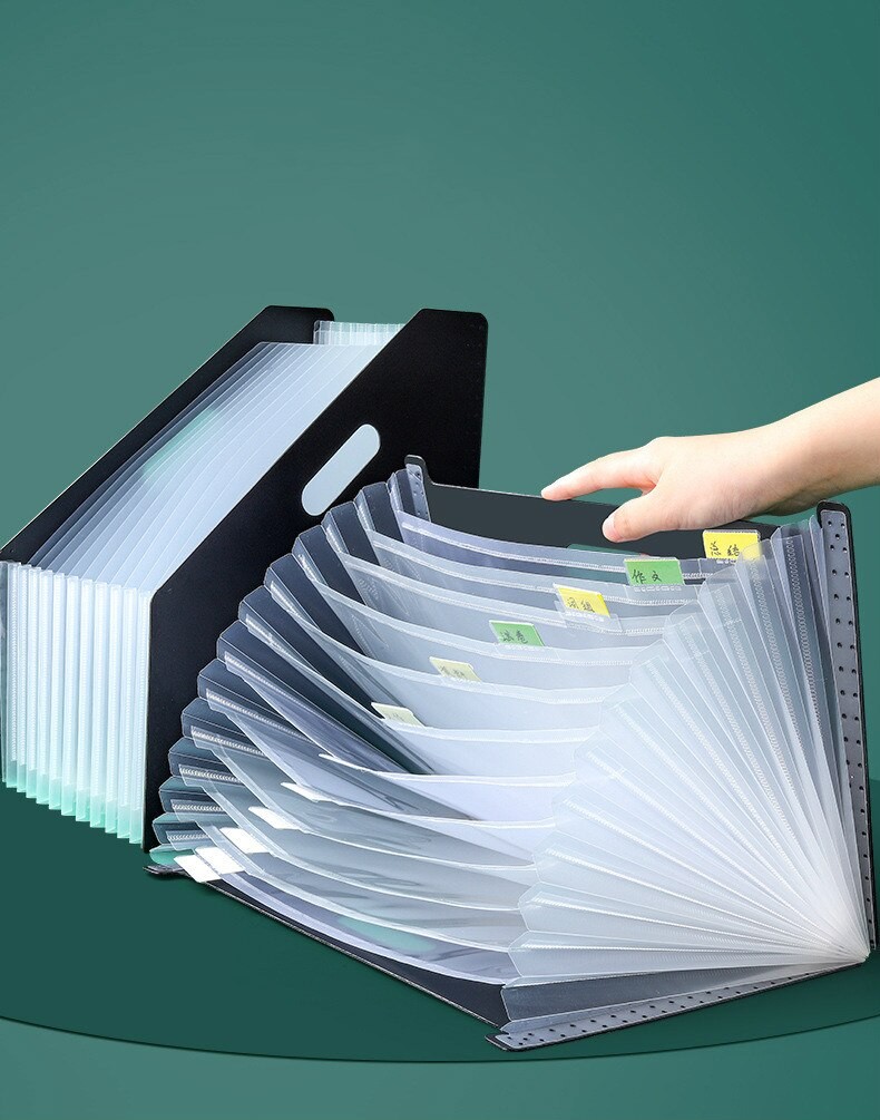 Con 13 compartimentos separados en cada carpeta, que le dejan mucho espacio para almacenar todos los archivos en una sola parada.