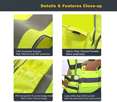 Bolsillos multifunción-Chaleco de seguridad de alta visibilidad diseñado con 5 bolsillos, 3 de los cuales tienen velcro flip-top para evitar que los artículos se caigan, 1 clip de insignia de identificación transparente de PVC en la parte delantera,. 1 bolsillo con solapa y 1 bolsillo pequeño para herramientas como linternas o bolígrafos. A continuación se muestran dos bolsillos de gran capacidad que pueden contener teléfonos móviles, cuadernos y otros artículos.