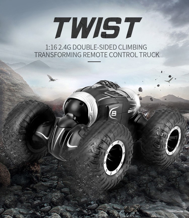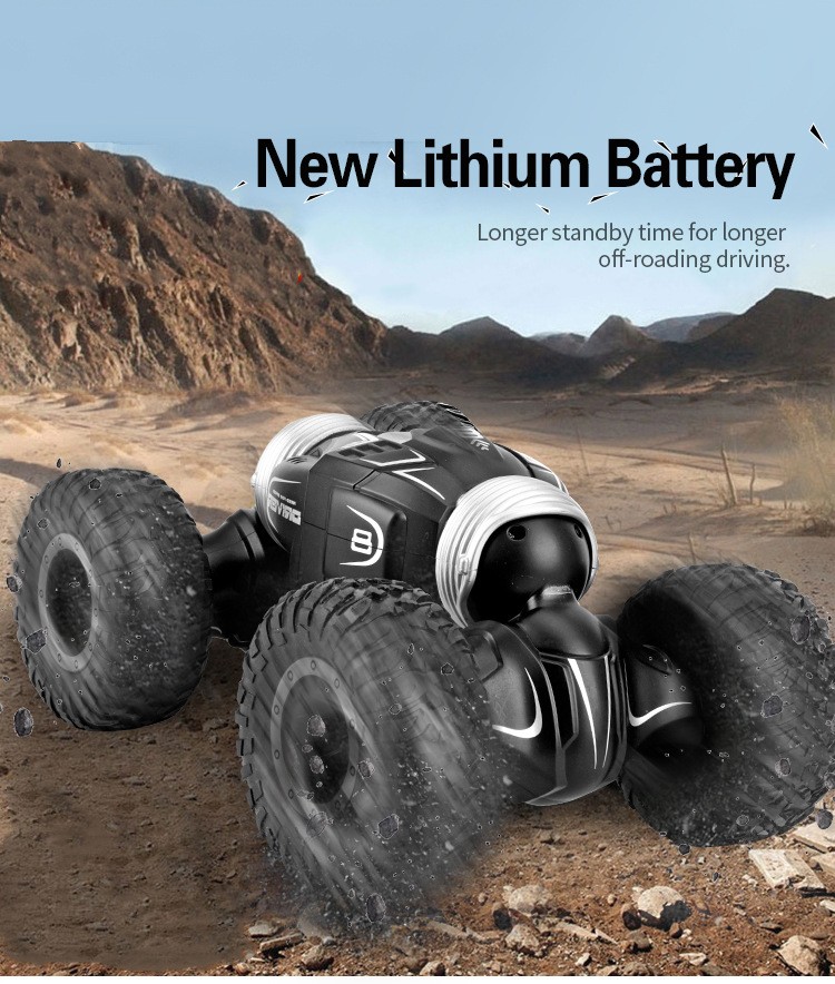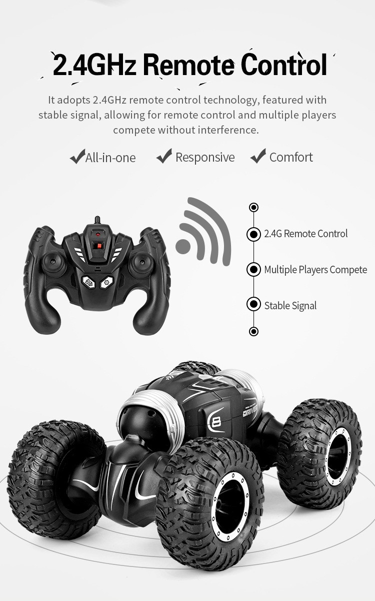 ¡Un vehículo RC de 2.4 gHz de doble cara con un potente motor cepillado, hace un salto mortal sin esfuerzo!