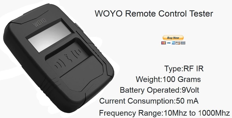 El probador de Control se ha desarrollado para ayudar en el diagnóstico de todo tipo de controles remotos de radiofrecuencia (IR), infrarrojos y (RF). El probador de Control remoto WOYO se puede utilizar en la mayoría de marcas y modelos de vehículos, incluidos camiones, modelos de control remoto y electrodomésticos.