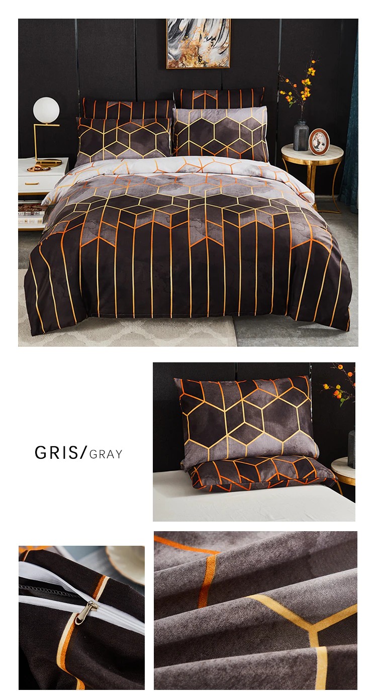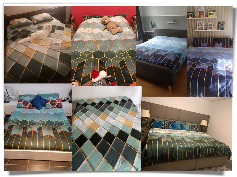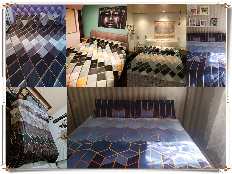 La cubierta del edredón de enrejado con patrón geométrico adopta un diseño clásico de gris y dorado de imitación (Nota: La línea es una combinación de amarillo y naranja, parece oro, no chapada en oro), animada y de moda, le da una sensación duradera y refrescante, adecuada para todas las edades. Este edredón es un estilo clásico que nunca pasará de moda.