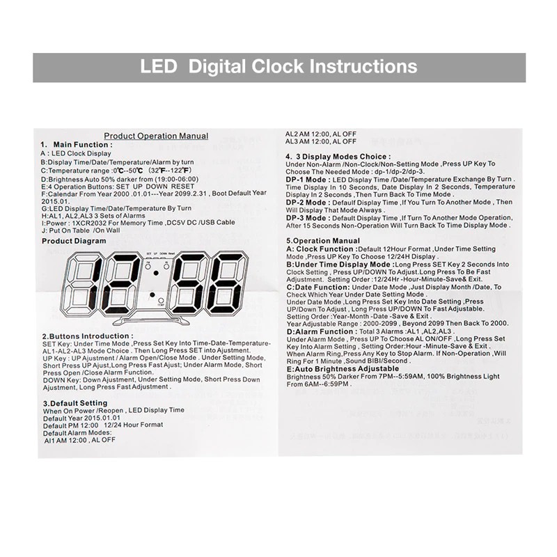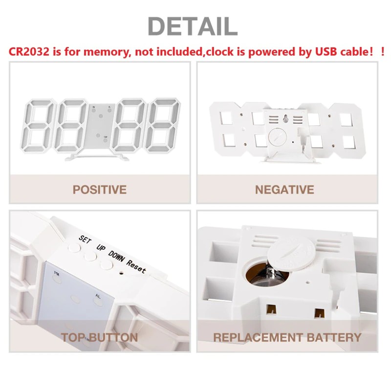 Batería: CR2032 (para el tiempo de memoria cuando se corta la energía, la batería no está incluida, el reloj está alimentado por cable USB)