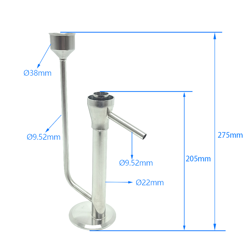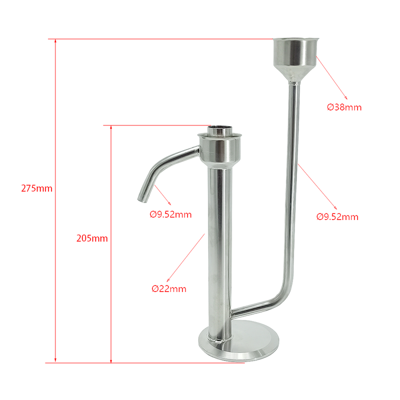 La altura total de la taza de entrada es de 275mm, la altura del cilindro de medición es de 200mm, el diámetro de la taza de entrada de líquido es de 38mm,. Y el diámetro del tubo de salida de vino es de 9,52mm. Es adecuado para la mayoría de los hidrómetros de alcohol.