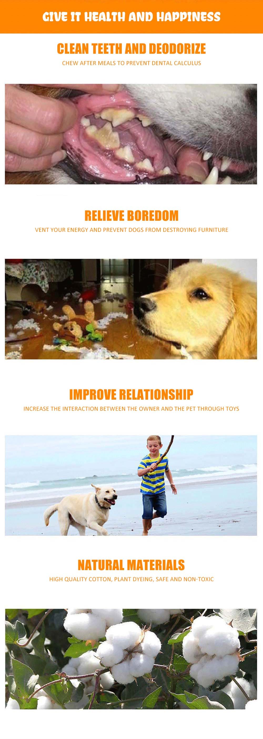 Cuatro ventajas principales: Limpiar los dientes y desodorizar, cuidado de la salud, moler los dientes de los cachorros, juego divertido, juego de acompañamiento, mejorar los sentimientos, cuerda de algodón de alta calidad, textura de algodón.
