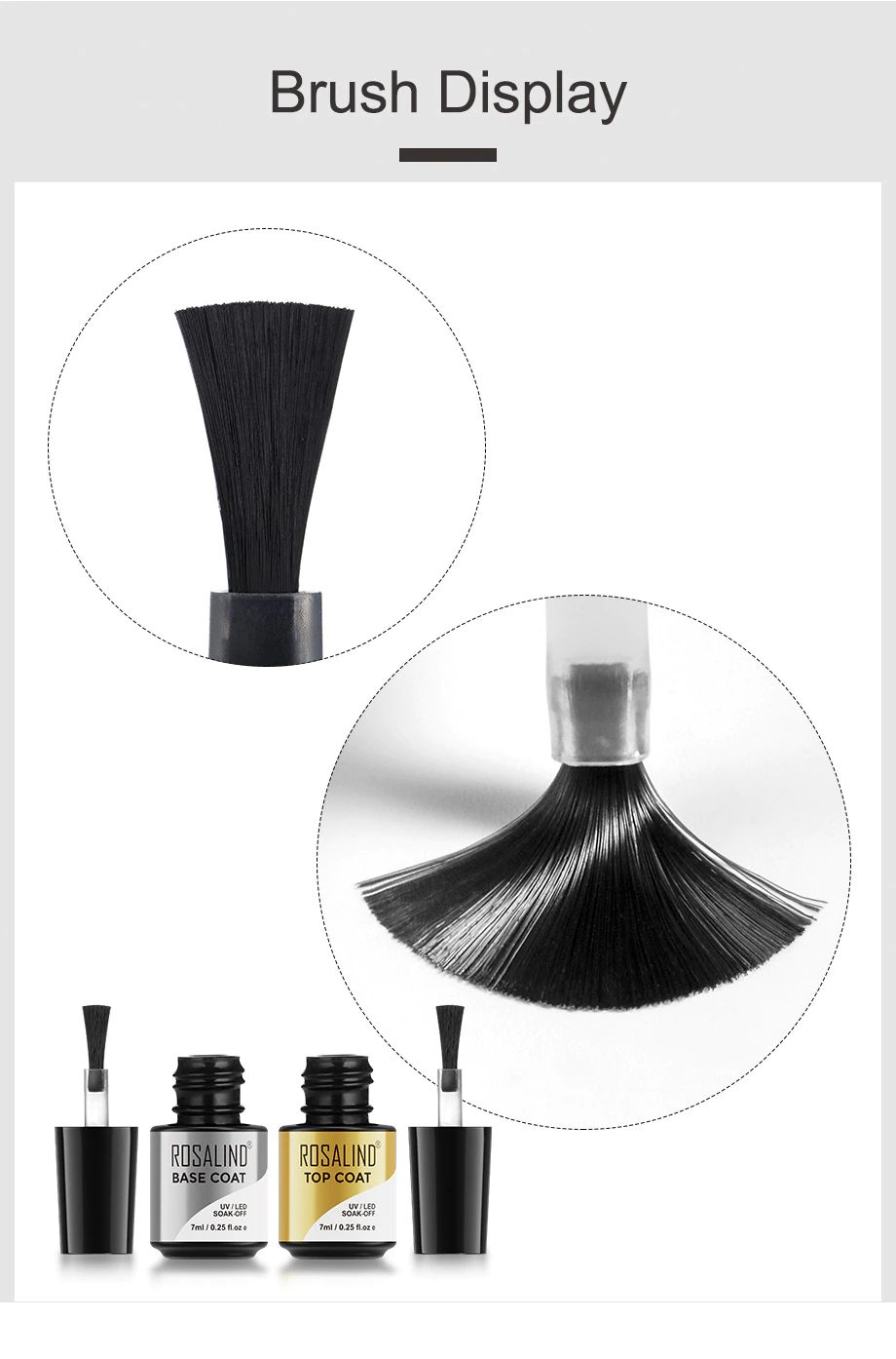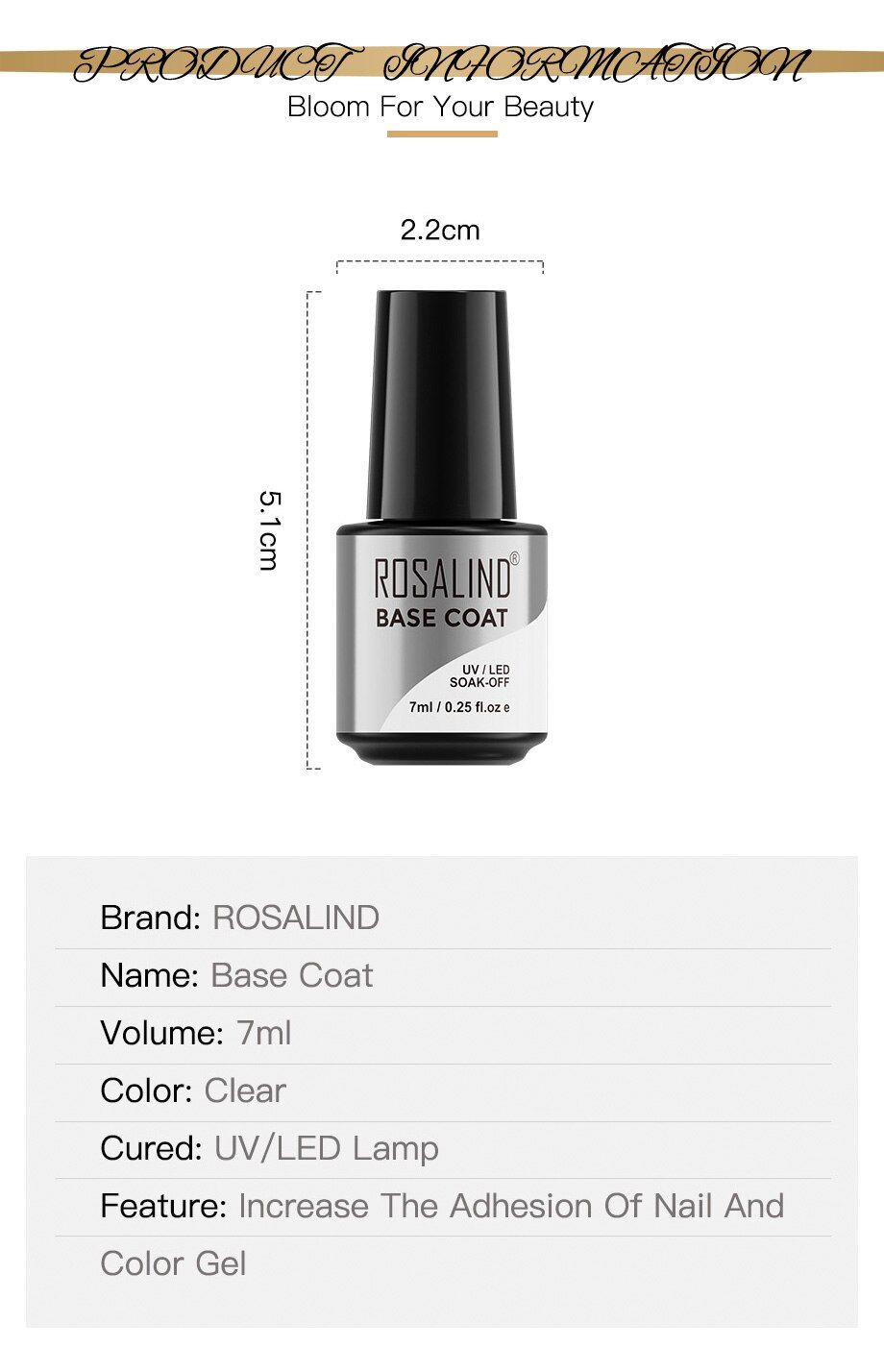 Especificaciones del artículo: Marca: ROSALIND Nombre: capa Base Volumen: 7ml Color: claro Curado: lámpara UV/LED Tamaño: 2,2*5,1 cm Características: aumenta la adherencia de las uñas y el Gel de Color Marca: ROSALIND Nombre: capa superior Volumen: 7ml Color: claro Tamaño: 2,2*5,1 cm Características: protege las uñas de la abrasión -La calidad es nuestra primera prioridad. -Casi sin olor (solo la capa superior y la base tienen un olor moderado), aplicamos solo textura orgánica para proteger su salud. -El cepillo es suave y fácil de aplicar. -Es de larga duración, y hace que el esmalte en gel dure 30 días Función Capa Base -Aumenta la adherencia de las uñas y el Gel de Color -Efecto de aislamiento y protección de las uñas -Decoración de uñas, No se Despega fácilmente Abrigo superior -Protege las uñas de la abrasión -Hace que las uñas sean suaves y brillantes -Evita que el Color se vuelva amarillo Paso a Paso: -1. Da forma a la uña. Pulir ligeramente la superficie de la placa de uñas. Desinfectar. -2. Aplique una capa base de base desde la cutícula hasta el borde libre (recuerde sellar el borde de la uña). Seca las uñas bajo la luz LED durante 10 segundos o una luz UV durante 2 minutos. -3. Aplique una capa fina de Soak-Off Gel Polish color a su elección. Borde libre de la tapa. Curado: 30 segundos en lámpara LED o 2 minutos en lámpara UV. -4. Repita la segunda capa fina del esmalte de Gel semipermanente en las uñas. Seque bajo la lámpara LED durante 30 segundos o una luz UV durante 2 minutos. -5. Aplica una capa superior. Borde libre de la tapa. Cura: 30 segundos en lámpara LED. -6. Retire los residuos pegajosos en las uñas con el limpiador. A continuación, aplique aceite nutritivo para cutículas para rehidratar la humedad en la cutícula y la piel que rodea la uña. Precaución: 1. El volumen es de 7ml. Dado que la capacidad de la botella es de más de 7ml, ¡el gel para uñas no se llenará completamente con la botella! 2. Mantener bien sellado. Mantener fuera de la luz solar. Mantener fuera del alcance de los niños.