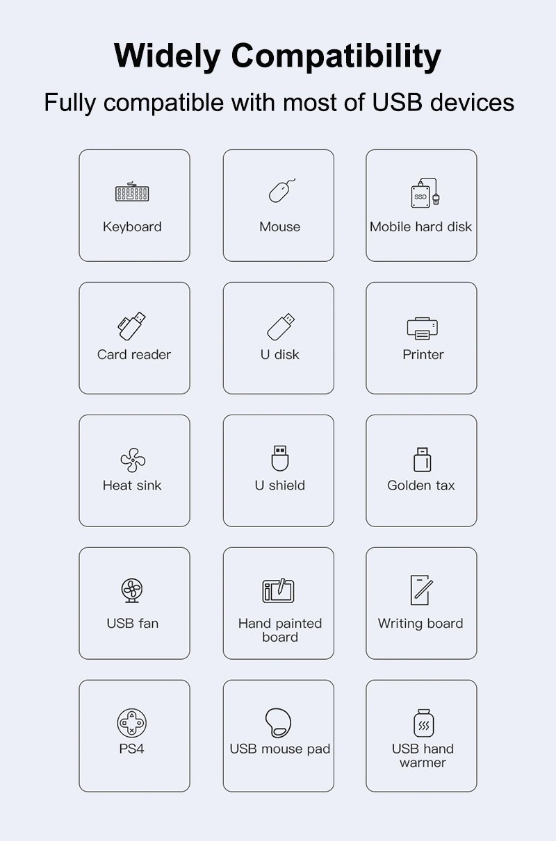 Totalmente compatible con la mayoría de dispositivos USB, teclado, ratón, disco u, cámara, auriculares usb, impresora, cable usb, micrófono, máquinas de juegos, ventilador usb, ordenador, ordenador portátil, etc.