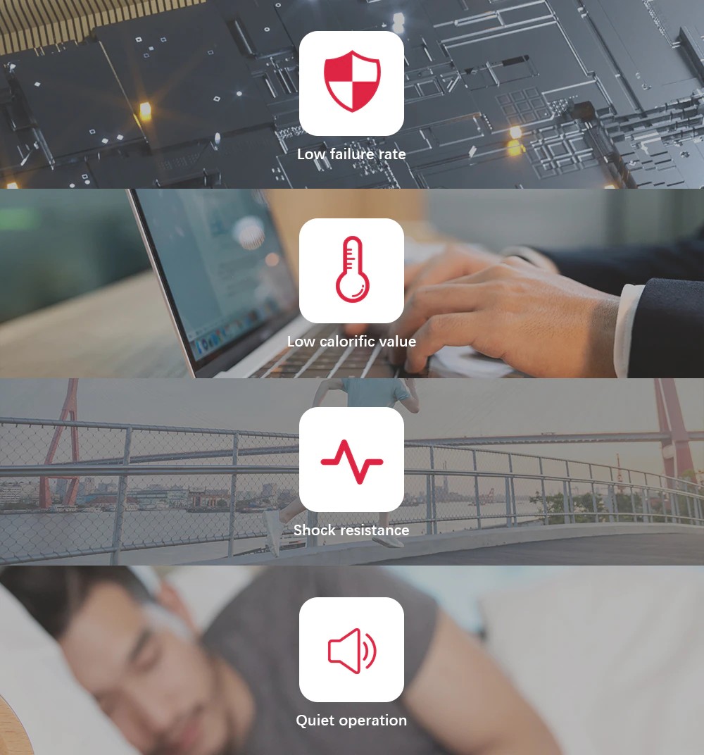 Resistente a golpes y vibraciones para una fiabilidad robusta cuando se utiliza en cuadernos y otros dispositivos de computación móviles.