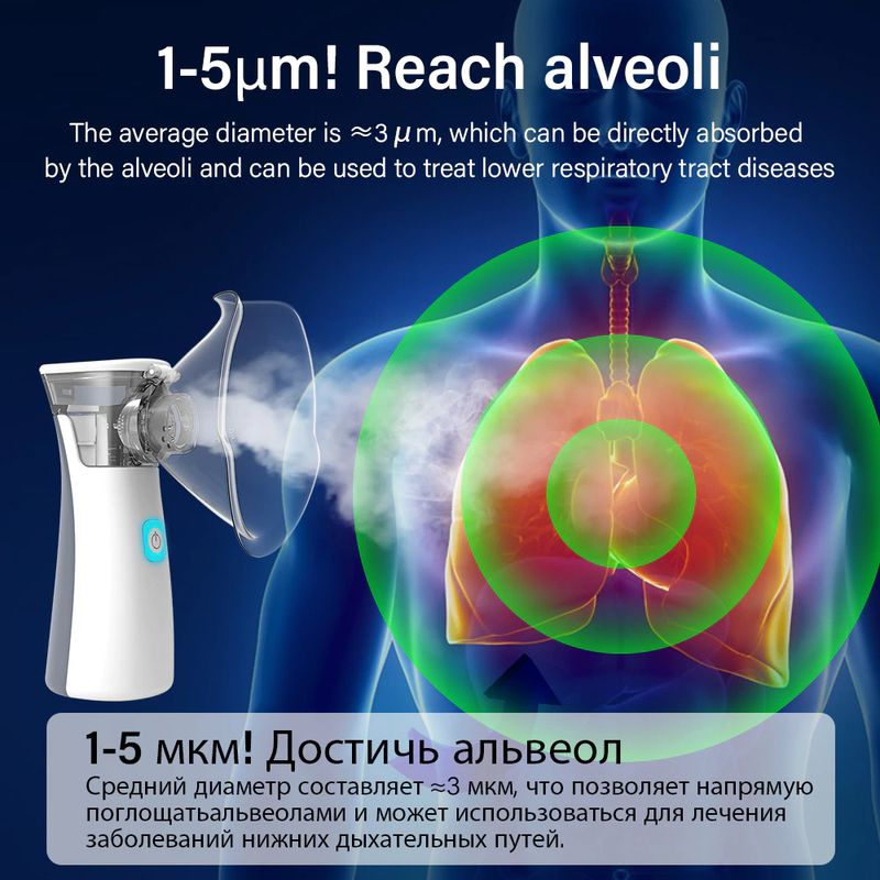 Las partículas atomizadas de micrones hacen que el proceso de atomización sea tan natural como la respiración, directamente a las vías respiratorias, la tráquea, El alveolus y las partes del tracto respiratorio inferior; El líquido se absorbe más fácilmente