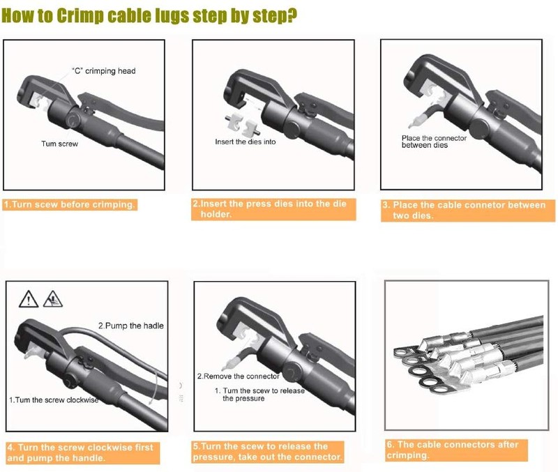 Conveniente de operar: la cabeza estilo C hace que la entrada lateral sea fácil de acceder y operar; Perilla de encendido/apagado para un fácil engaste y retracción del brazo; Cambio de matriz sin herramientas; asas antideslizantes largas de 8 "para operaciones de prensado fáciles y seguras