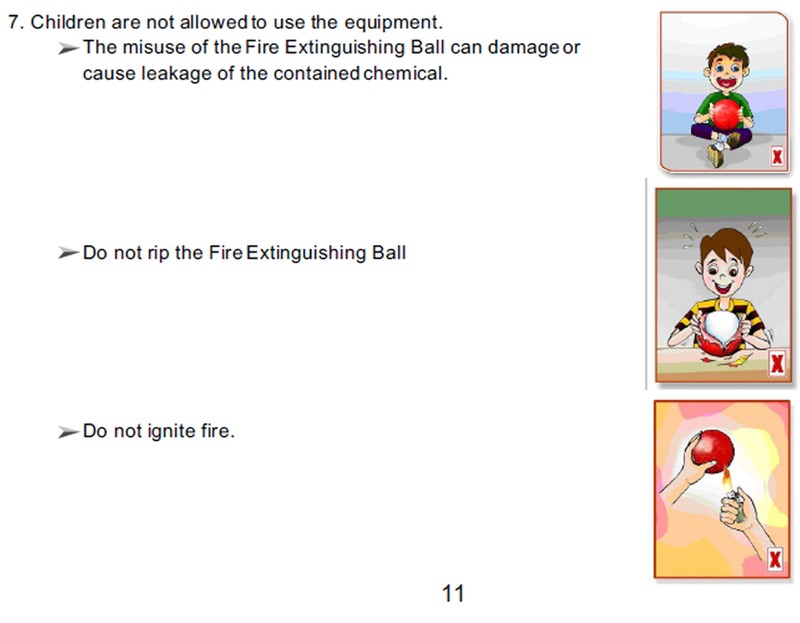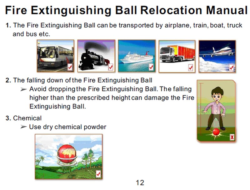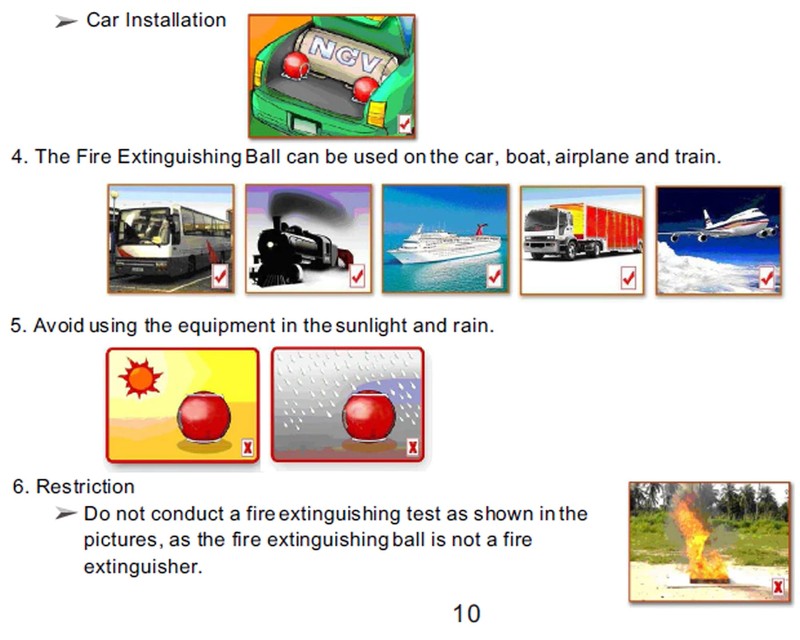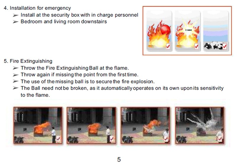 1. Simplemente arroje al fuego, al lugar del fuego o instálelo en posición propensa al fuego, en caso de incendio, la bola del extintor se puede llevar a cabo automáticamente con respuesta rápida.