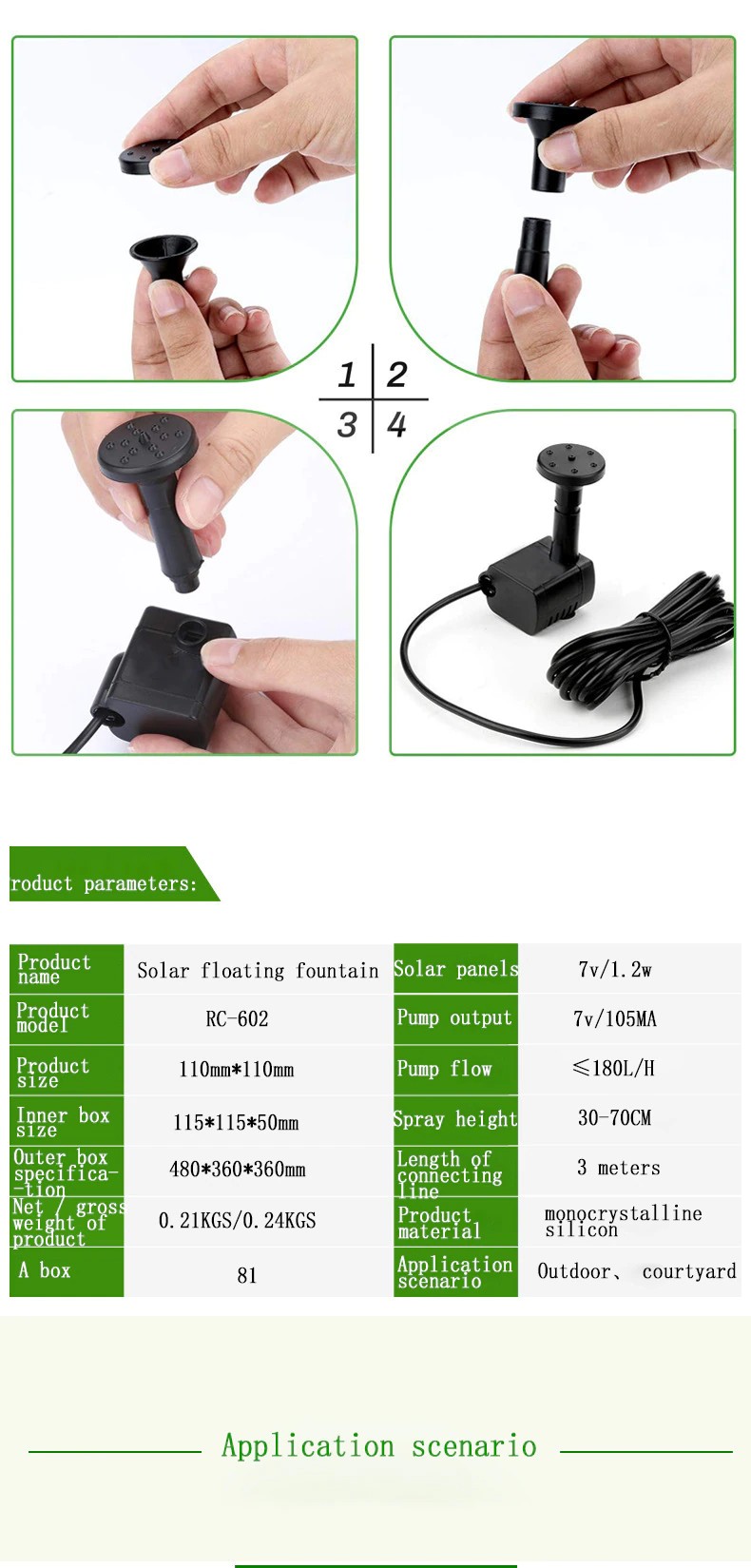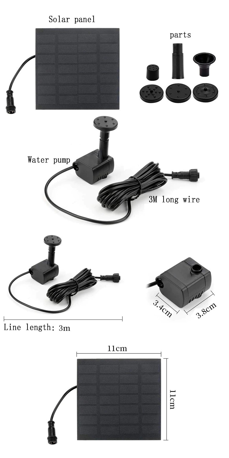 1.この製品は、追加バッテリーなしのソーラーダイレクトドライブウォーターポンプです。 水スプレーの高さは完全に太陽の強さに依存します。 太陽が弱い場合、ウォーターポンプは連続して動作しませんが、太陽が一定の強度に達するまで自動的に繰り返し起動し、ウォーターポンプは連続動作状態に戻ります。 使用するときは、製品をシールドされていない太陽の下に置いてください。 シェーディングはウォーターポンプの通常の動作に影響します。