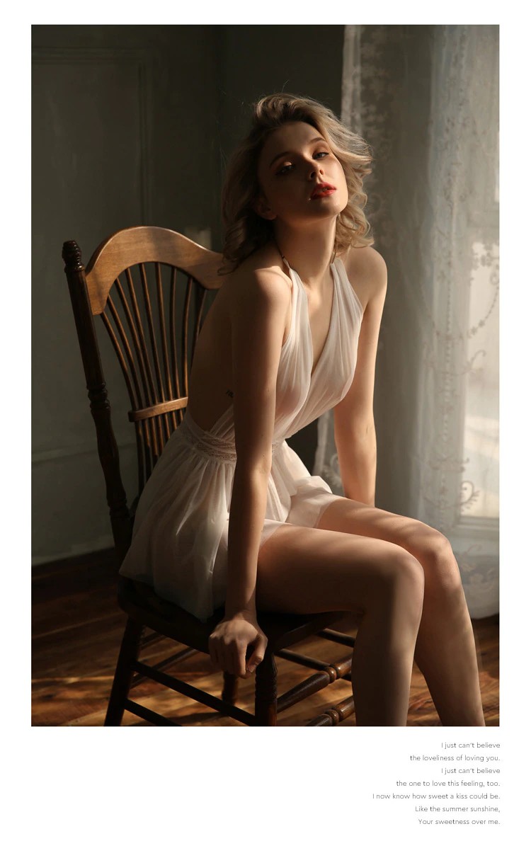 Belle Robe De Nuit En Dentelle Gaze, Dos Nu, Tentation Blanche Sexy Maille Col Suspendu Fée Tulle Perspective, Chemise De Nuit