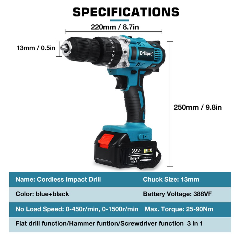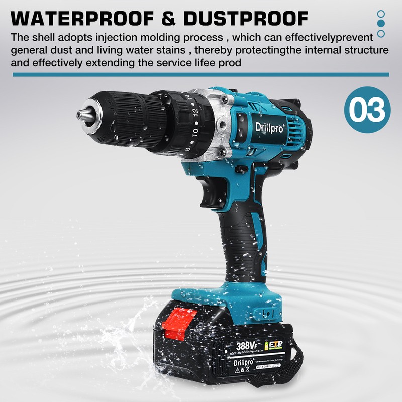 Drillpro Perceuse Électrique 3 En 1, Tournevis Sans Fil 13Mm, Marteau Perforateur, Outils Électriques Avec 2X15000Amh Batterie Li Pour Batterie Makita