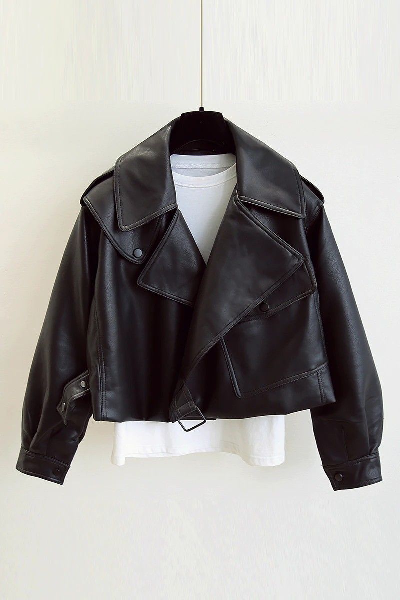 Ftlzz Blouson De Motard En Faux Cuir Femme, Col Rabattu, Rouge Et Blanc Pu Streetwear Ample Vêtements D'Extérieur, Printemps