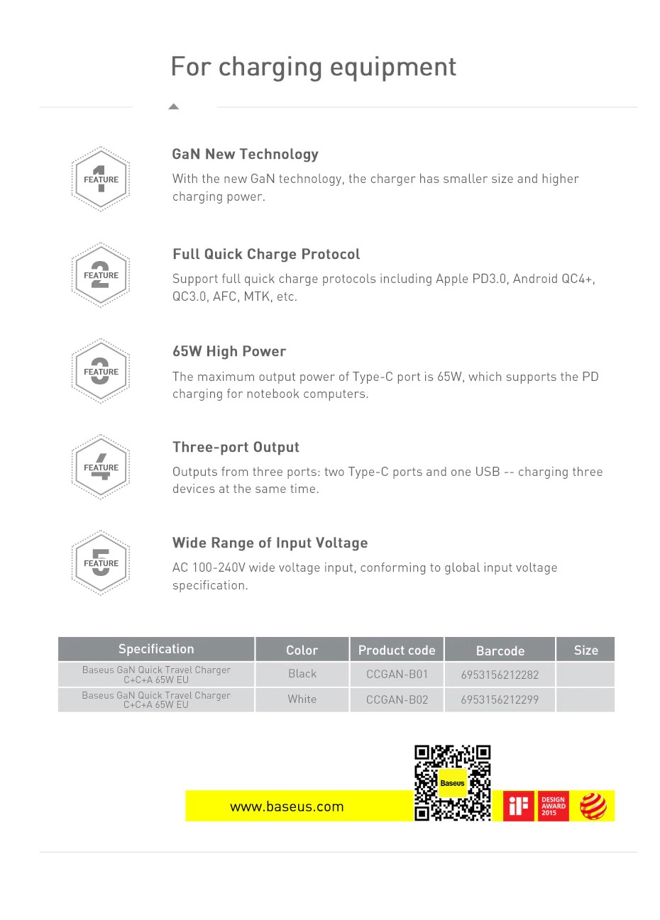 Numéro de modèle: chargeur rapide de baseus gan 65w