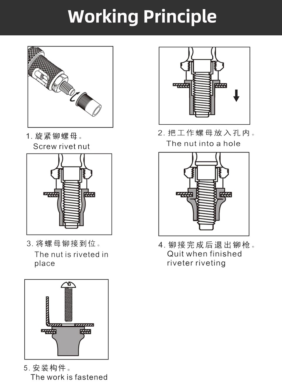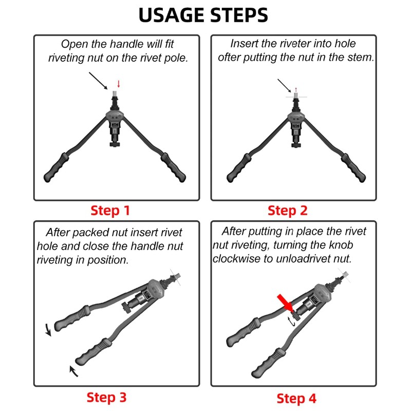 1. Ouvrez la poignée s'adapte à l'écrou de rivetage sur la tige de rivet.