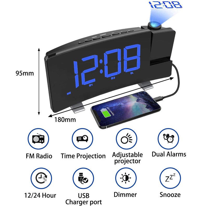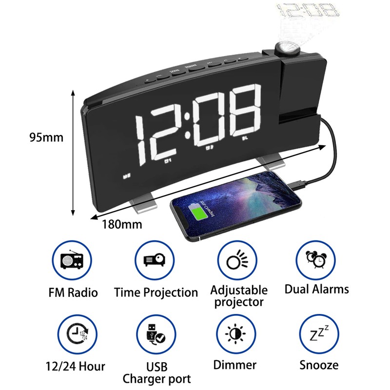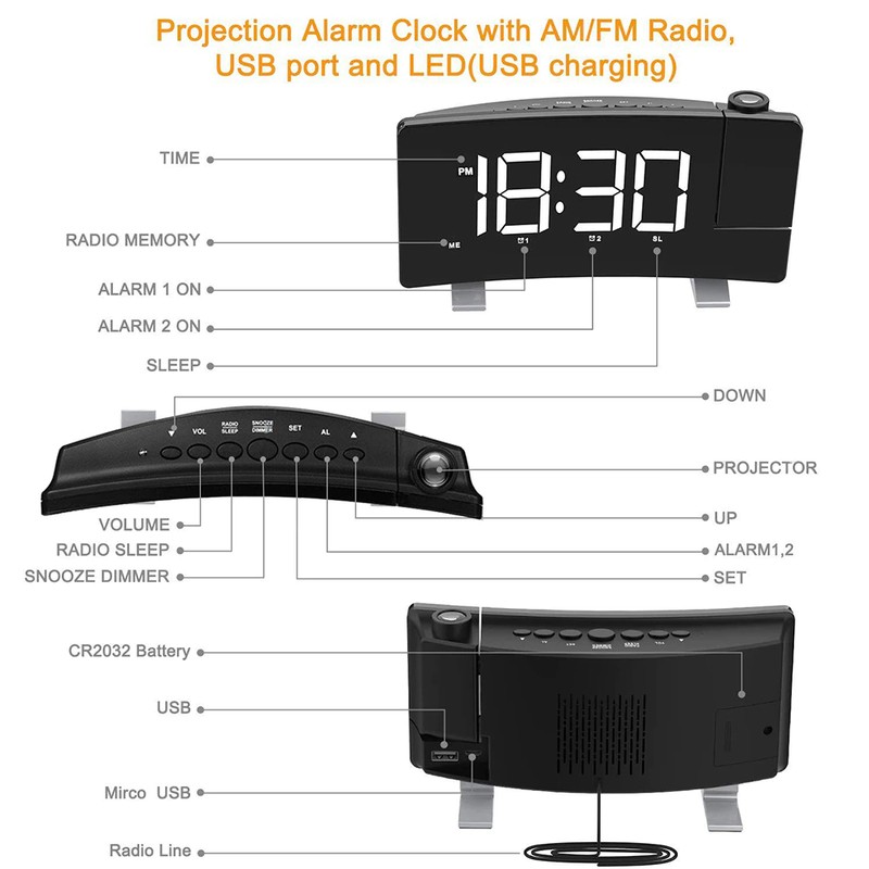 Réveil De Table À Projection Numérique Led, Horloge Électronique, Avec Diffusion De Radio Fm Projecteur L'Heure, Pendule Chevet De Chambre À Coucher