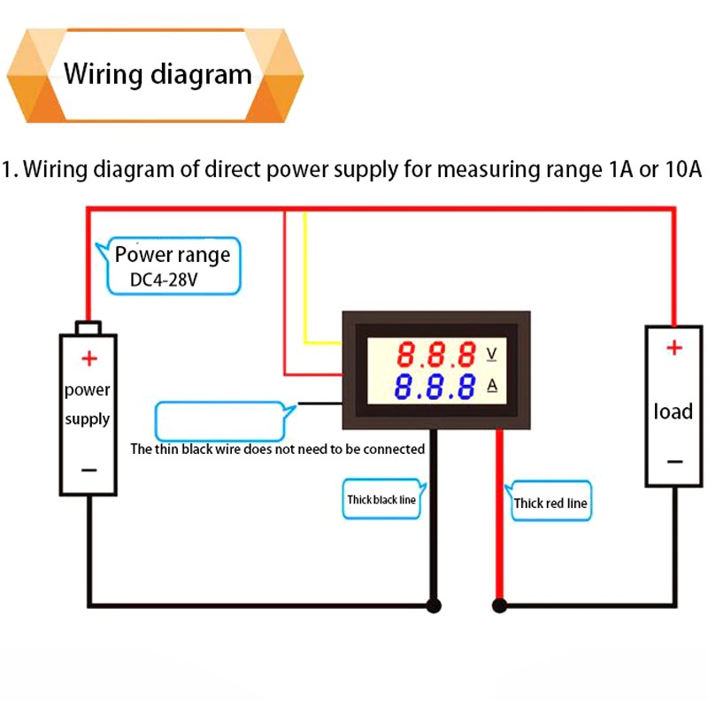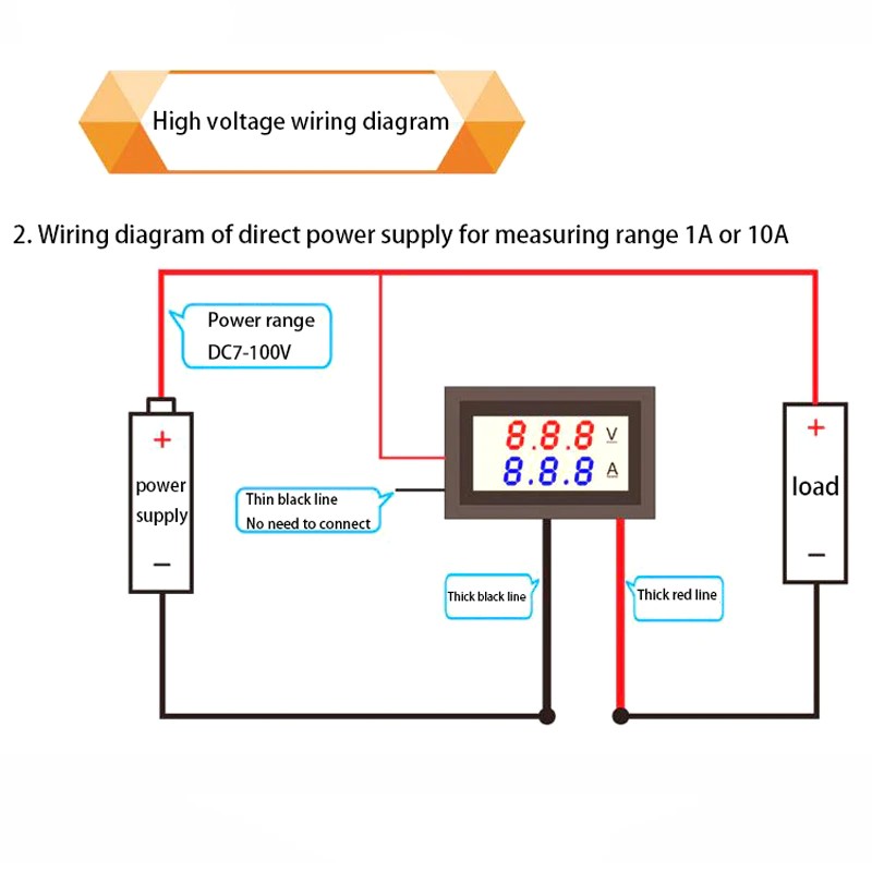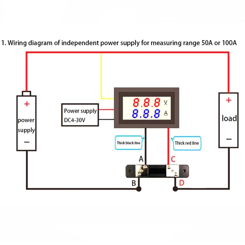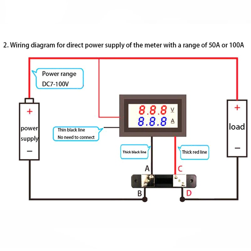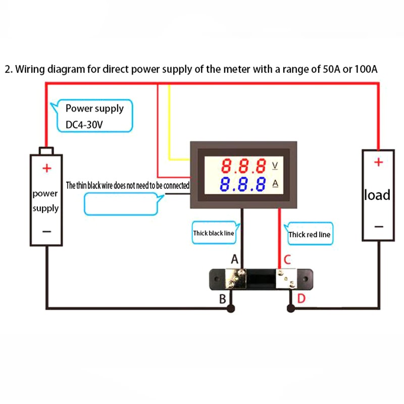 Sans le shunt, connectez le fil rouge fin et le fil noir fin à l'alimentation. Le courant du compteur avec une plage de 50A affiche 50.0 ~ 59.9, et le compteur avec une plage de 100A affiche 100 ~ 109;