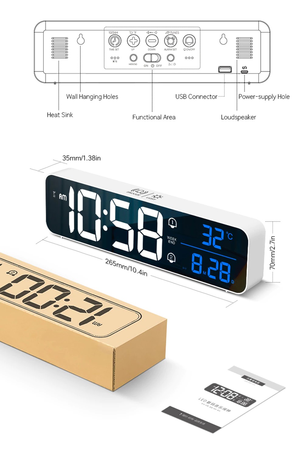 Réveil numérique combiné avec miroir de maquillage, réveil et heure, calendrier, fonction d'affichage de la température. Avec l'écran de 10.4 pouces et les grands chiffres LED, vous pouvez clairement vérifier l'heure partout dans la pièce. Avec capteur de température. Il ne peut pas surveiller la température intérieure. Cette horloge numérique est comme un compagnon pour protéger votre santé. Technologie de miroir Unique, elle peut vous aider à prendre soin de votre apparence à tout moment. En mode économie d'énergie, l'horloge détecte le son au-dessus de 90db, l'affichage LED s'allume. Taper sur votre bureau, tousser, taper sur vos mains, piétiner vos pieds, etc., fera tourner votre réveil comme par magie pendant 6 secondes.