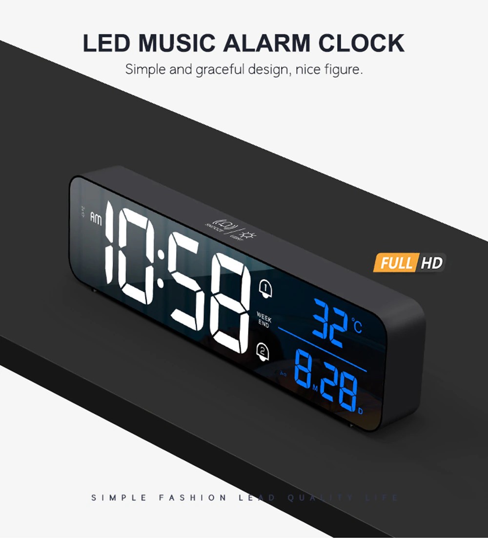 Réveil Numérique À Led, Musique, Affichage De La Température Horloge De Bureau Miroir Décoration De Table Commande Vocale, Batterie 2400Mah