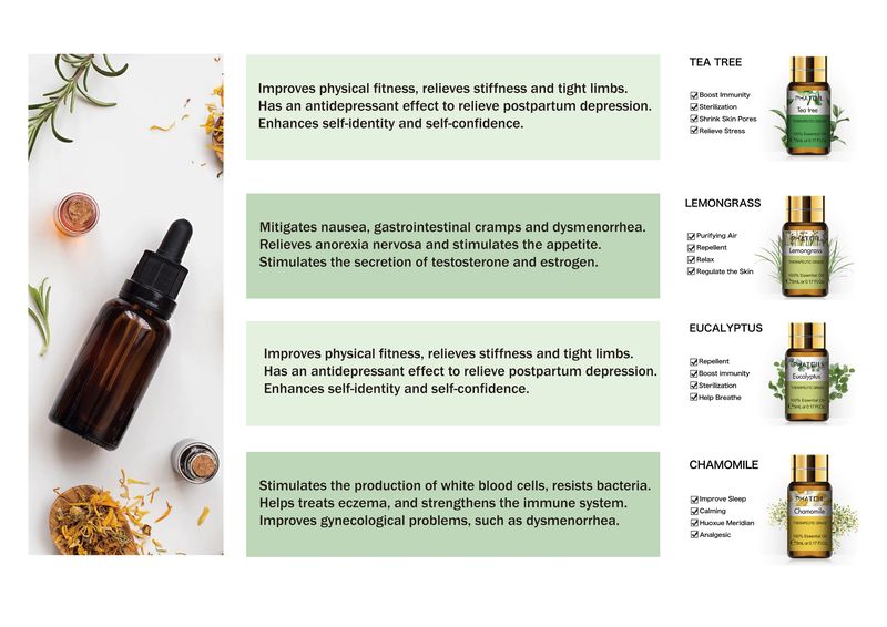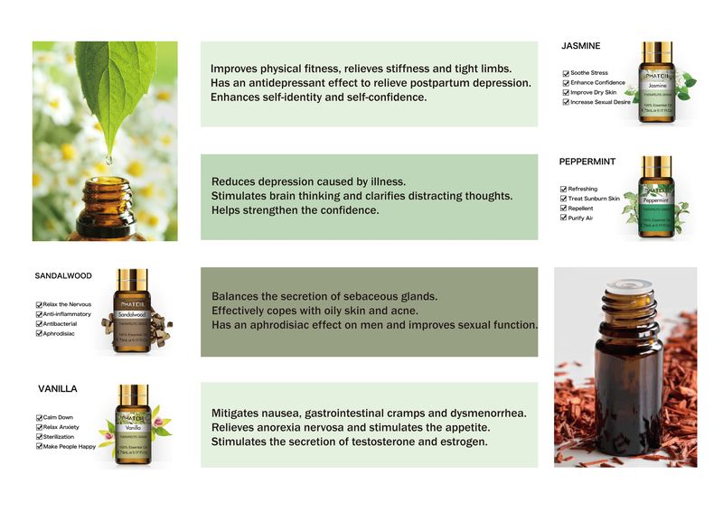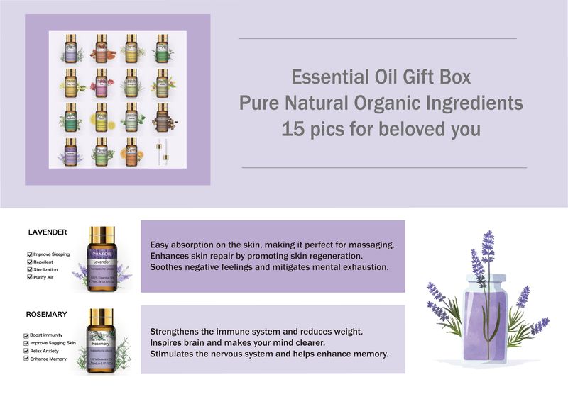 15 huiles essentielles de 5ml par ensemble, vous pouvez utiliser un type de parfum d'huile essentielle une fois ou vous pouvez obtenir les huiles essentielles que vous voulez. Voici huit huiles essentielles Collocation pour votre référence, vous pouvez choisir la collocation d'huile essentielle dont l'efficacité est ce que vous devez atteindre. Utilisez cet ensemble d'huiles essentielles, vous pouvez profiter de différents parfums d'huile essentielle à chaque fois