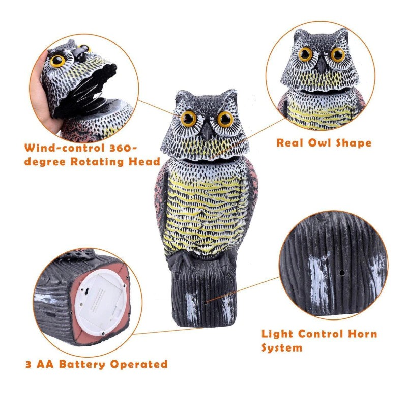 Épouvantail Très Réaliste Pour Repousser Les Oiseaux, Hibou En Plastique Avec Tête Rotative Et Son Pour Protéger Votre Jardin, Cour Extérieur, Aide À La Lutte Contre Les Nuisibles