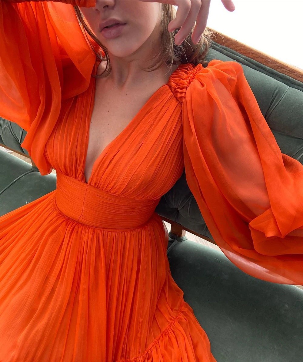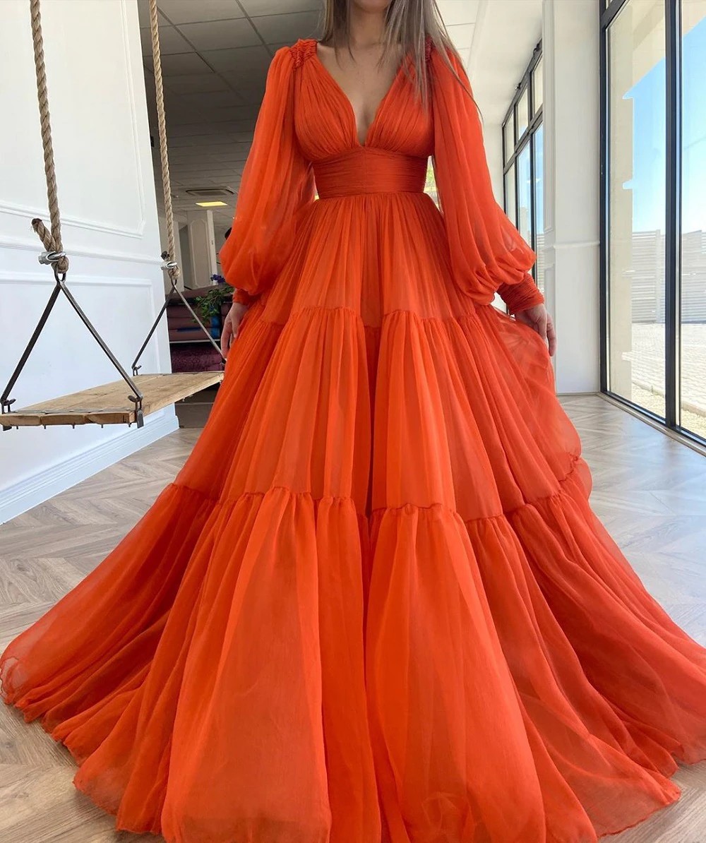 Sevintage – Robe Princesse En Mousseline De Soie, Tenue De Bal, Soirée De Fête Grande Taille Manches Longues Bouffantes Col En V Avec Plis, Tendance Le plus récent