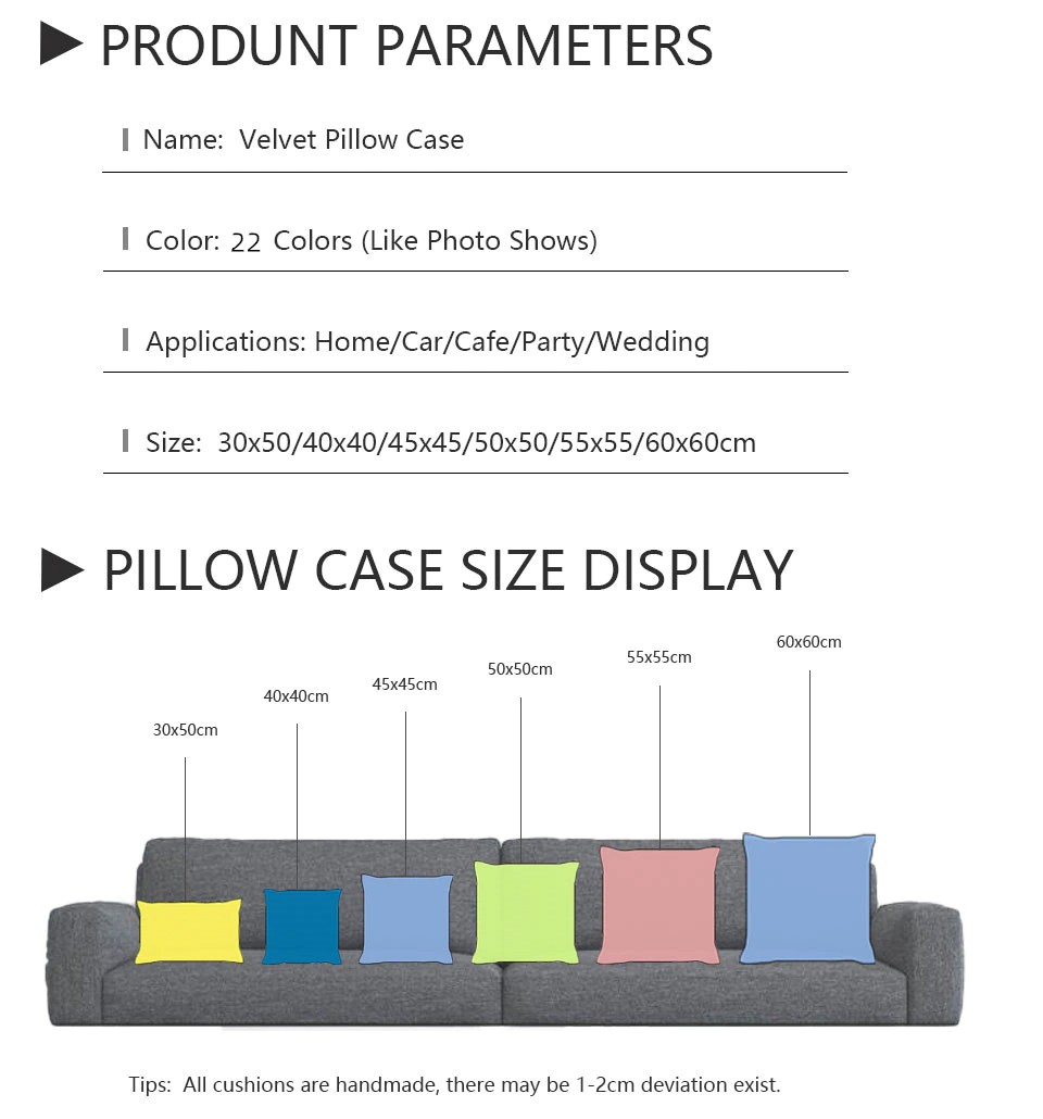 Matière: velours Taille: 30x50cm/40x40cm/45x45cm /50x50cm/55x55cm/60x60cm Utilisation: décoration de la maison, canapé, siège, chaise, voiture, lit, salon Emballage: housse de coussin 1PC (sans noyau)