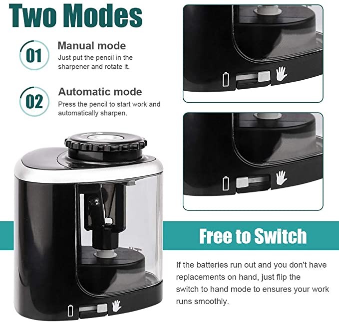 Notre affûteur électrique a deux modes à choisir. Mode automatique: appuyez sur le crayon pour commencer à travailler et affûter automatiquement, suffisamment pour aiguiser facilement chaque crayon dans la position idéale et durable en 3-5 secondes. Mode manuel: lorsque la batterie est faible, vous pouvez passer en mode manuel pour aiguiser les crayons de couleur, puis devenez un manuel d'aiguisage de crayon exceptionnel lorsque vous dessinez avec des enfants à l'extérieur.
