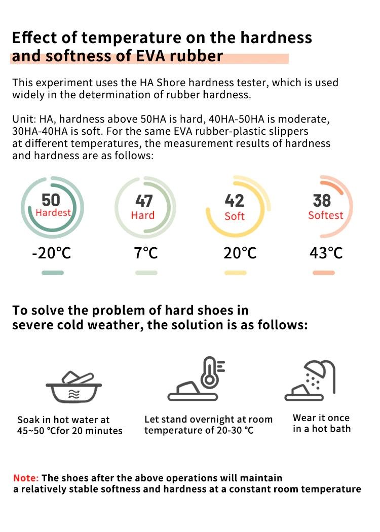 Pour les pantoufles EVA, évitez les températures élevées et l'exposition au soleil pendant l'utilisation quotidienne ou après le lavage.