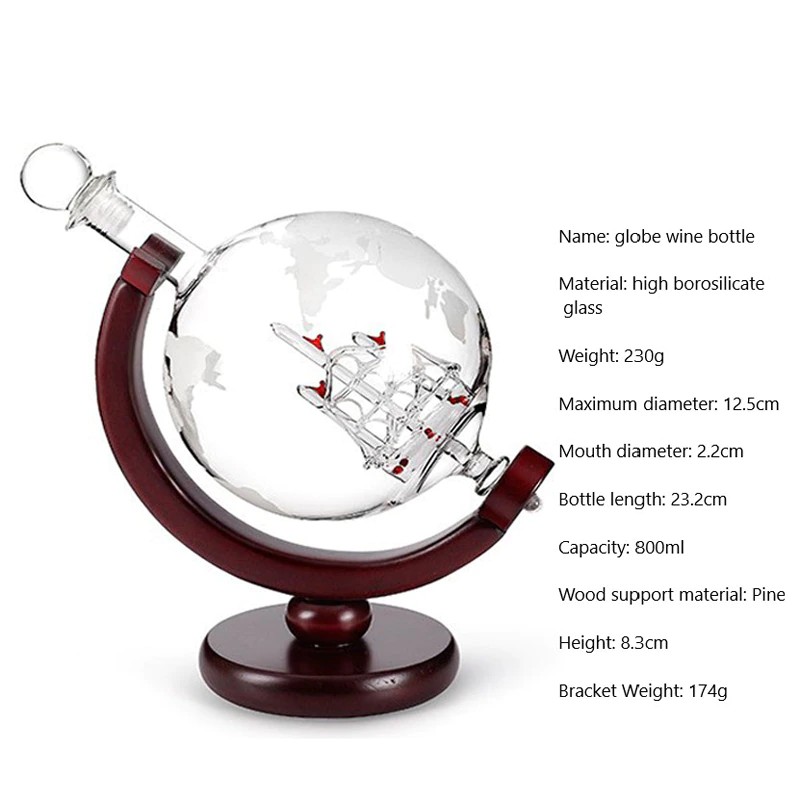 Carafe globe de 28 Oz 850 ml gravée dans le monde avec un navire personnalisé, une base en bois, un entonnoir en métal et un bouchon en verre.