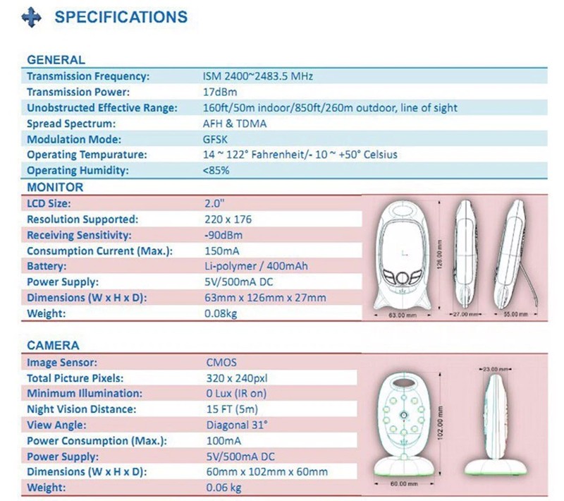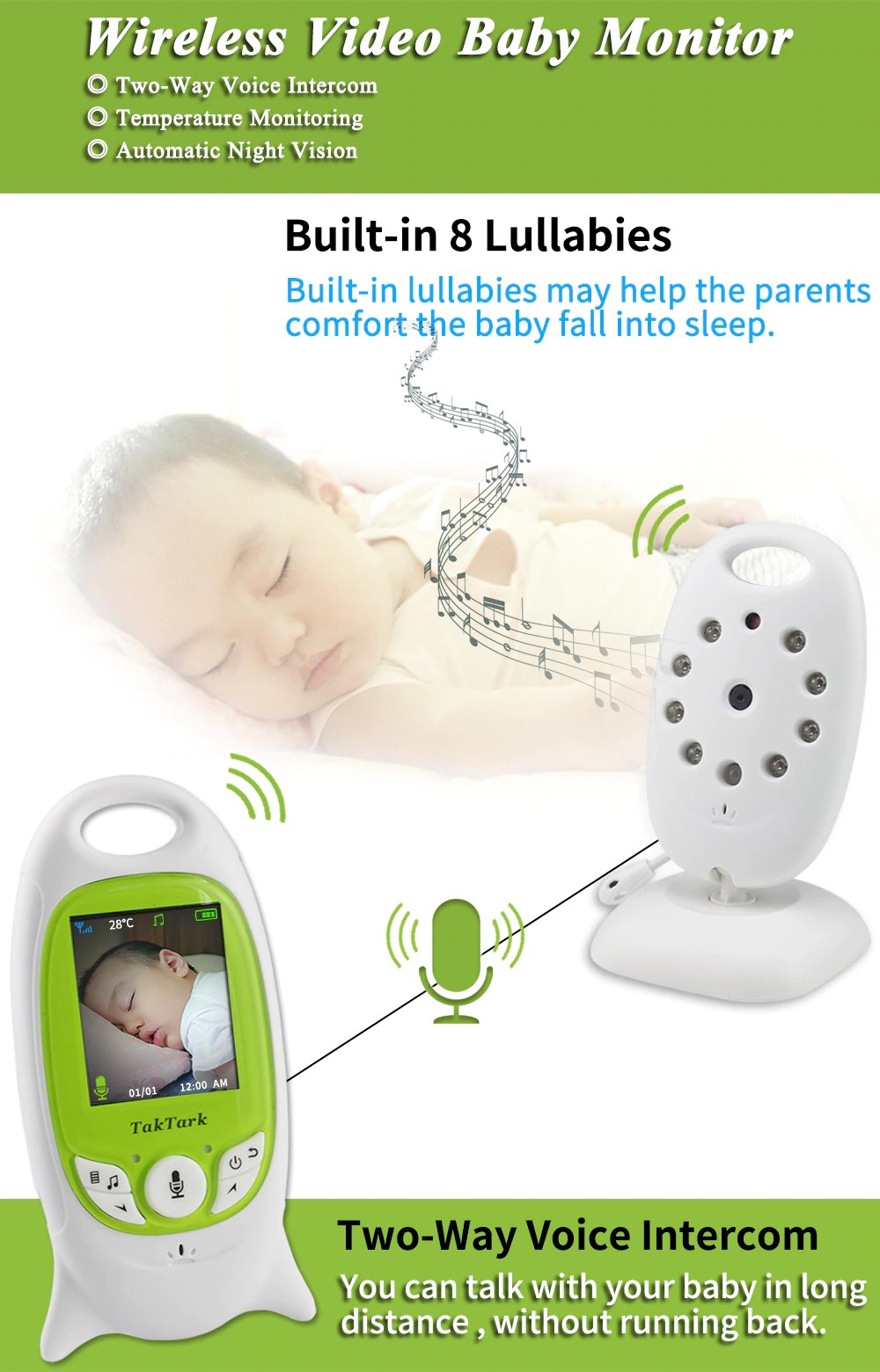 12, audio bidirectionnel entre la caméra et le moniteur, vous pouvez parler à bébé.