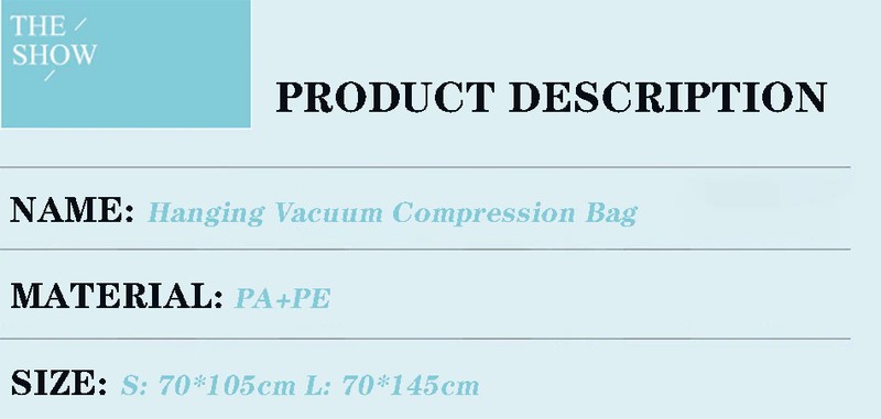 Naam: Opknoping soort vacuüm zuignap kleding compressie zak Materiaal: PA + PE Kleur: transparant Maat: S: 70*105cm L: 70*145cm Functie: Opvouwbaar, grote capaciteit, vocht-proof, stof-proof, insect-proof, meeldauw-proof, ruimtebesparend, super dragende, zacht en slijtvaste, geen geur, eenvoudige en stijlvolle, gemakkelijk te winkel, vacuüm ontwerp, leuke patronen, nette opslag ruimte en goede helper Toepasselijk scenario: slaapkamer, woonkamer, studie, etc.