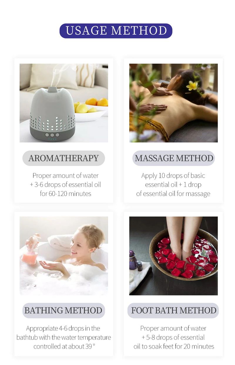 Massaggio-I Nostri oli sono forte, in modo che si prega di non utilizzare direttamente sulla pelle. L'aggiunta di un paio di gocce di oli per un vettore (ad esempio come olio di Vinaccioli), andthen massaggiare su di esso per la fronte, le palme, collo, schiena, piedi o altre zone colpite miracoli.