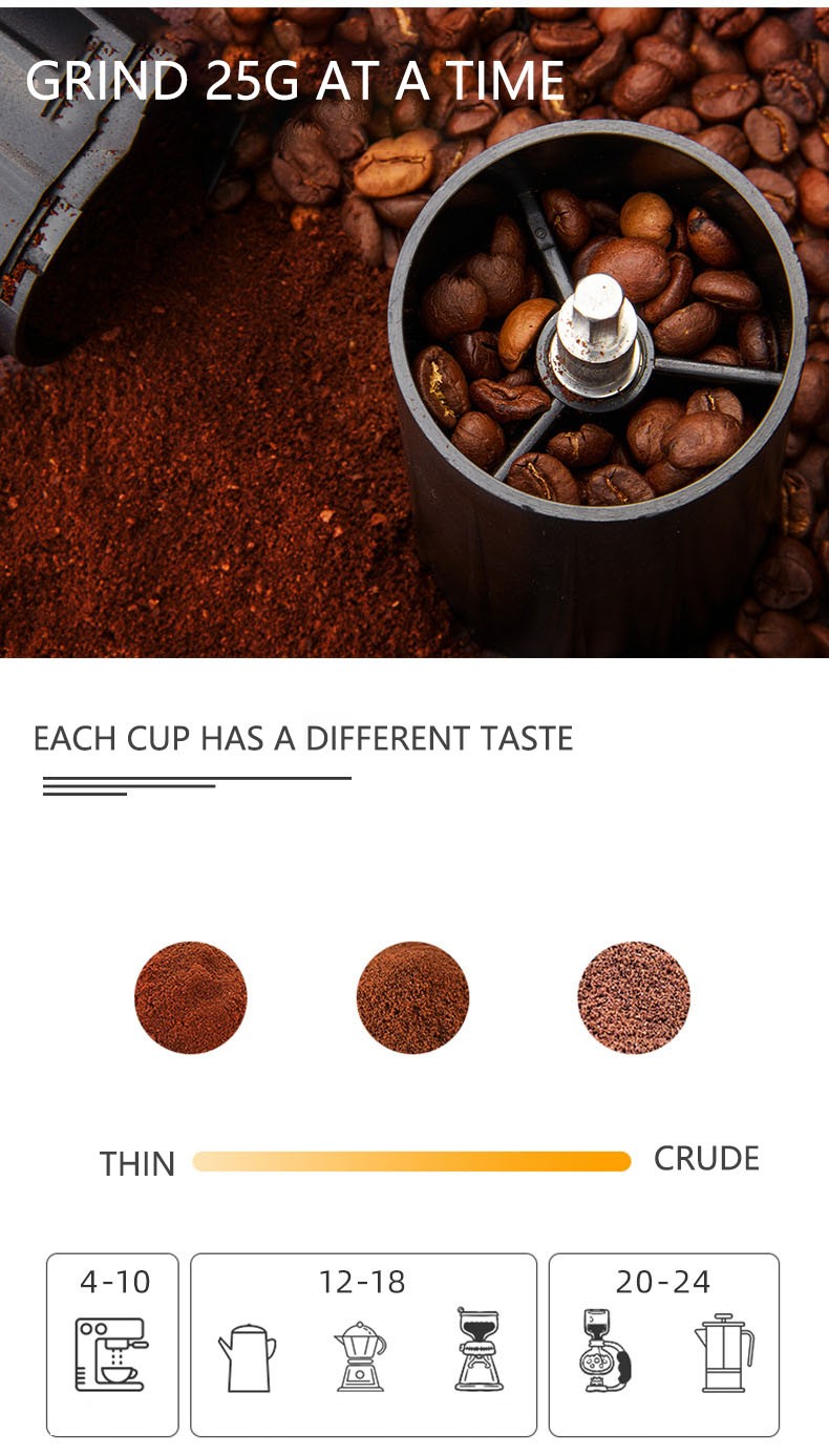 Prefer grinding size: Built-in adjustable grind knob ensures you have precision control over the coarseness of your pour over, drip, cold brew, percolator, Espresso.