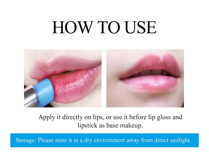 Applicare direttamente sulle labbra, o usarlo prima di lip gloss e rossetto come base per il trucco. Conservazione: Si Prega di conservare in un ambiente asciutto, lontano dalla luce diretta del sole.