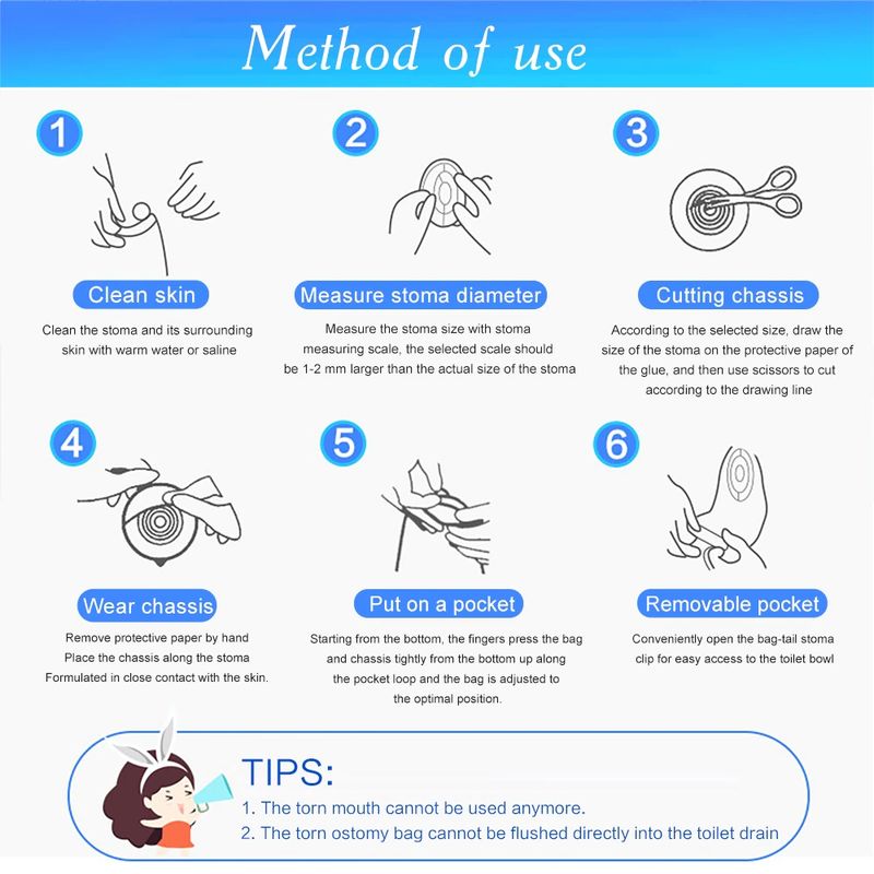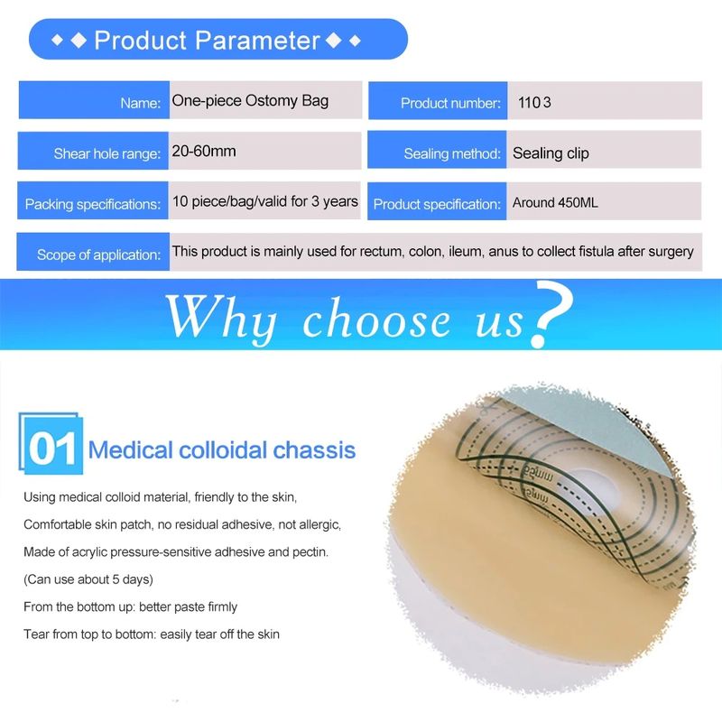 Descrizione del prodotto Sacchetto di Cura stomia combina la barriera della pelle e la raccolta del sacchetto in un semplice, facile-a-gestione del sistema, fornendo grande semplicità. La colostomia sacchetto è facile da applicare con il attaccato Velcro Chiusura fornendo di sicurezza si può sentire come la plastica elementi di fissaggio bloccano in posizione, facile da svuotare e irrigare. Lo scopo di sostituire la stomia 1. Osservare il stoma mucosa, che circonda punti di sutura e la pelle circostante. 2. Pulire la pelle intorno al stoma, ridurre l'odore e aumentare il comfort. 3. Prevent acqua fecale di contaminare il addominale incisione attraverso il telaio perdite. 4. Se c' è di impregnazione, assicurarsi di sostituire in tempo. Si consiglia di cambiare il tempo per 3-5 giorni al fine di garantire la respirazione della pelle efficace. Stomia vita senso comune 1. Mangiare in modo uniforme, bere un sacco di acqua, e mangiare più frutta e verdura. 2. Evitare di mangiare troppo veloce e ingestione di aria, da masticare cibo lentamente, evitare di parlare mentre si mangia, evitare di mangiare troppo in una sola volta. 3. Evitare di alta fibra di diete e impedire il blocco di stoma. 4. I vestiti sono morbidi e confortevoli. 5. Avoid lavoro per aumentare la pressione addominale (ad esempio come estrazione oggetti pesanti) 6. Keep il vostro stato d'animo felice. Cornici e articoli da esposizione 10 pz/scatola Stomia