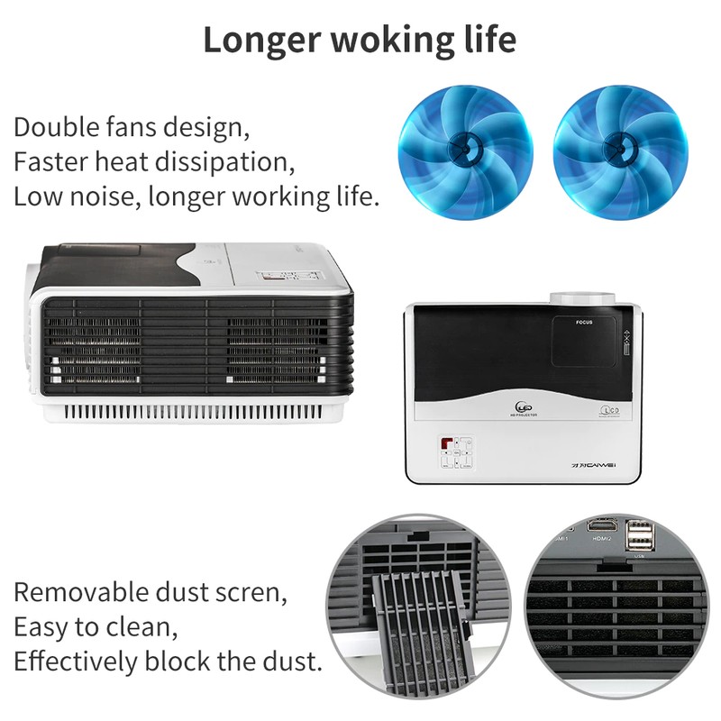 Il proiettore è dotato di sistema di raffreddamento avanzato, si può estendere la vita del proiettore. Doppio appassionati di design, più veloce dissipazione del calore. A basso rumore, vita lavorativa più lunga. Il proiettore è dotato di rimovibile rete a prova di polvere, è facile da pulire, effectivelyblock la polvere.