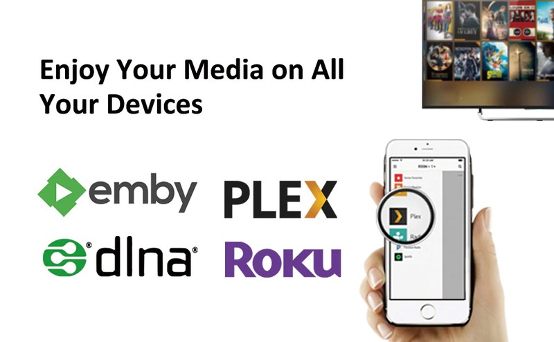 Supporta Emby e Plex media server, che mantengono i tuoi video, musica, E le foto di media personali di ben organizzato, sempre pronto per on-demand in streaming per il vostro PC, dispositivo mobile, smart TV, o giochi di console.