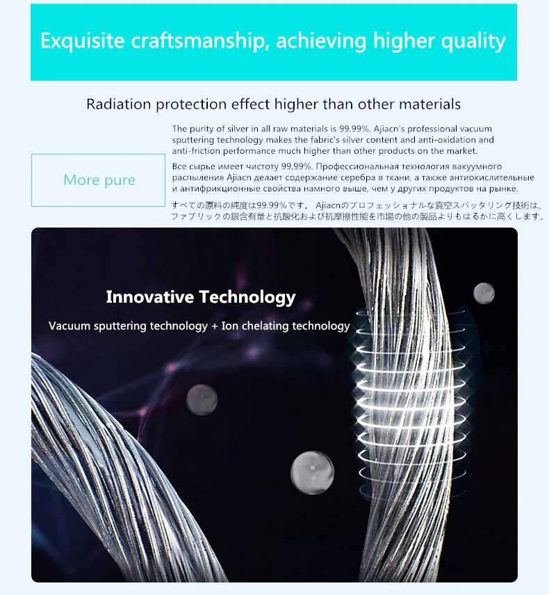 La fibra d'argento resistenti alle radiazioni di protezione Cappellini sono high-tech prodotto ottenuto da in modo permanente bonding argento per una superficie in fibra di attraverso una tecnica speciale. Questa struttura non solo rende la fibra d'argento mantenere la originale tessili per la proprietà, ma dà anche tutto il La funzione magica di argento, il magico effetto di fibra d'argento. Argento ha la più efficace proprietà antimicrobiche. Fibra d'argento resistenti alle radiazioni a prova di tessuto fatto di argento-contenente fibra utilizzando la nanotecnologia è l'ultima resistenti alle radiazioni a prova di la tecnologia in tutto il mondo dopo tessuto in fibra di metallo anti-radiazioni. Ha le funzioni di protezione dalle radiazioni, anti-batteriche e anti-fouling, ed è la produzione di radiazioni a prova di Cappellini tessuto ideale. Il suo effetto anti-radiazioni è superiore alle radiazioni a prova di tessuto fatto di altri materiali metallici, che può essere indossato vicino al corpo e benefico per il corpo umano.