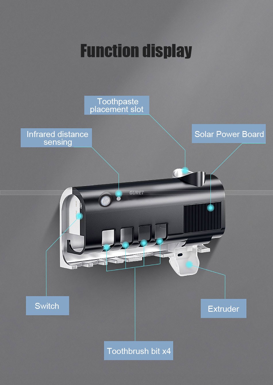 GURET Energia Solare UV Spazzolino Da Denti Supporto A Parete Spazzolino Da Denti Sterilizzatore Dispenser Automatico di Dentifricio Spremi Accessori Per il Bagno